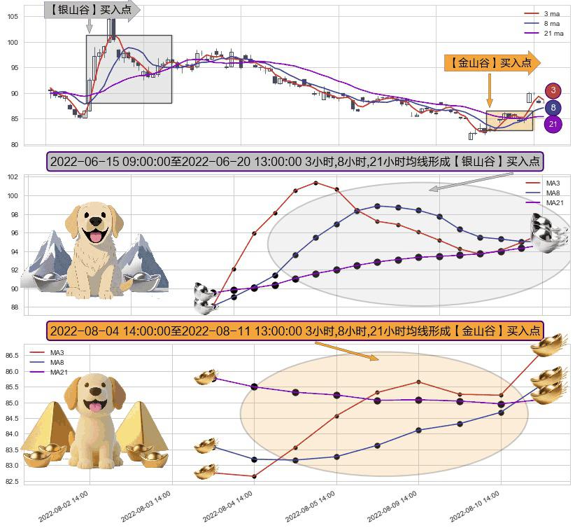 ⚀ 2022-08-05 13:00:00-小时至2022-08-11 13:00:00-小时显现 3小时-8小时-21小时均线 【金山谷】买入点 其再次确认了买入信号,可靠性更强,买入