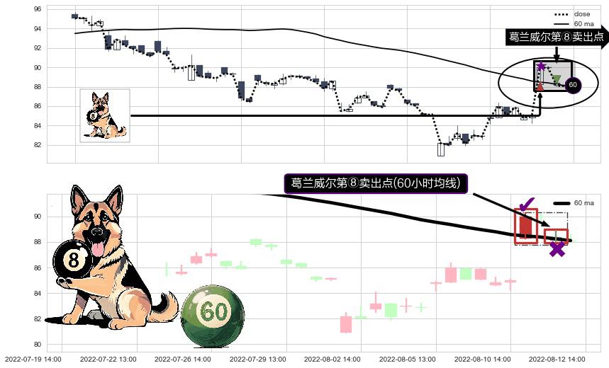 ⚀ 2022-08-12 13:00:00-小时显现 葛兰威尔均线 60小时均线 第⑧卖出点 下降趋势的中继信号,后市看跌,卖出信号
