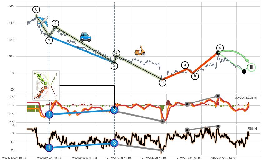 ➣ 第一, 三, 五浪下跌动能逐渐【衰弱变小】,趋势呈现不稳迹象