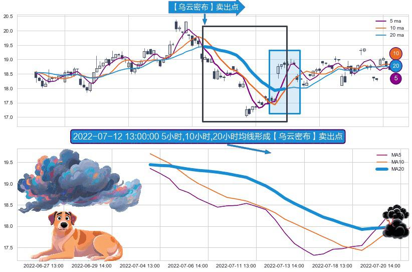 ⚀ 2022-07-01 14:00:00小时-2022-07-20 13:00:00小时显现 5小时-10小时-20小时均线 【乌云密布】卖出点 看空信号,后市看跌,卖出