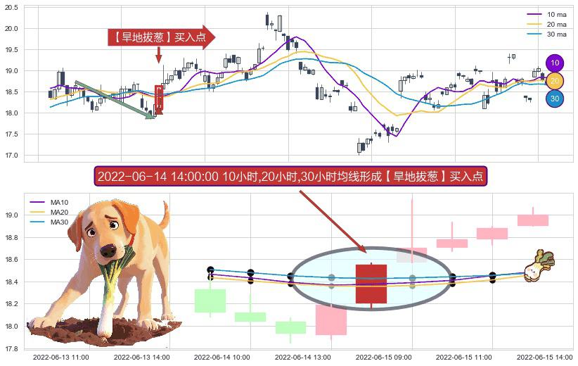 ⚀ 2022-06-14 14:00:00小时显现 10小时-20小时-30小时均线 【旱地拔葱】买入点 看多信号,后市看涨,买入
