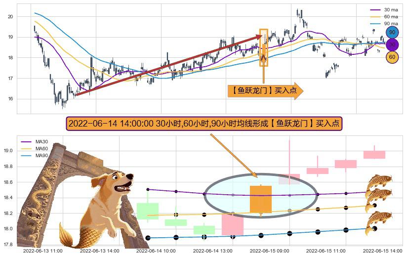 ⚀ 2022-06-14 14:00:00小时显现 30小时-60小时-90小时均线 【鱼跃龙门】买入点 看多信号,后市看涨,买入