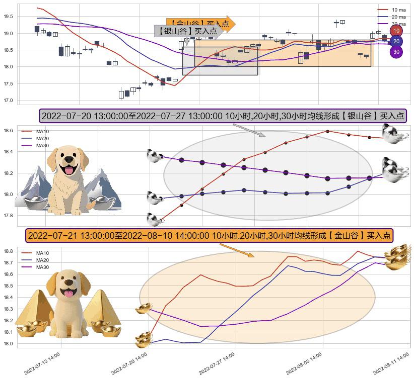 ⚀ 2022-07-21 14:00:00-小时至2022-08-10 14:00:00-小时显现 10小时-20小时-30小时均线 【金山谷】买入点 其再次确认了买入信号,可靠性更强,买入