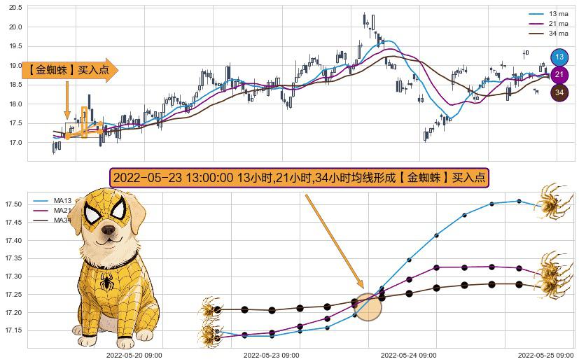 ⚀ 2022-05-23 13:00:00小时显现 13小时-21小时-34小时均线 【金蜘蛛】买入点 看多信号,后市看涨,买入