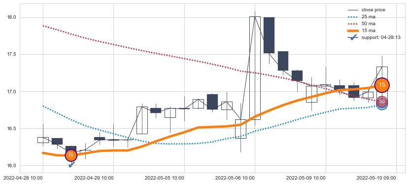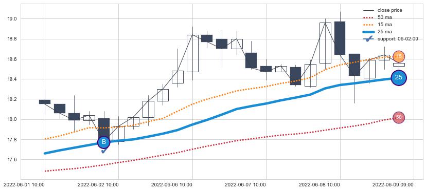 ⚂ 2022-07-12 13:00:00-小时均线向下破位,2022-07-19 13:00:00-小时重新上穿突破均线,均线支撑再次生效