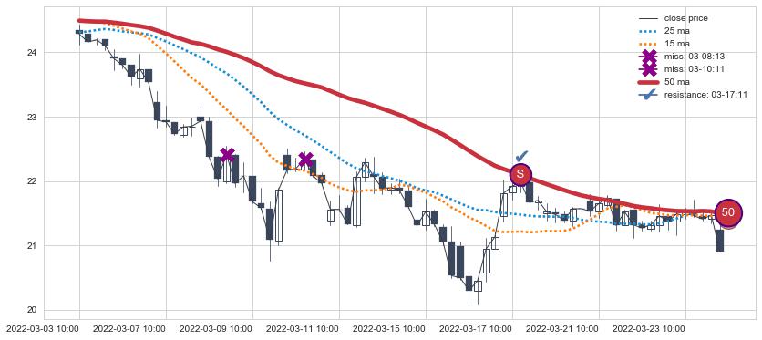 03-03 10:00至03-28 14:00 慢线与快线呈空头排列, 慢线与快线接触少,无缠绕