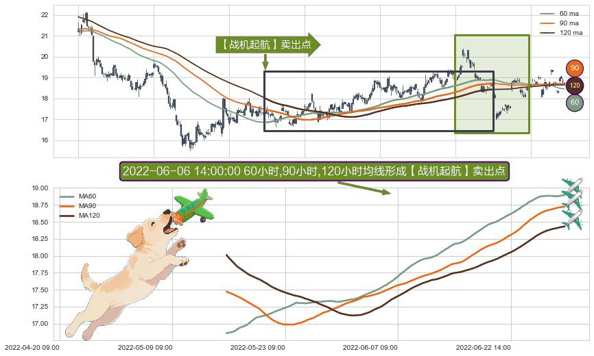 ⚀ 2022-05-13 14:00:00小时-2022-07-08 14:00:00小时显现 60小时-90小时-120小时均线 【战机起航】卖出点 看空信号,后市看跌,卖出