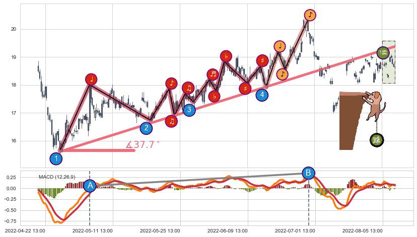 从2022-04-26 14:00至2022-06-16 09:00,共包含162个小时,阶段股价上涨21.08%,阶段股价变动位移路程比: 1 : 6,上涨趋势角度: 36.8