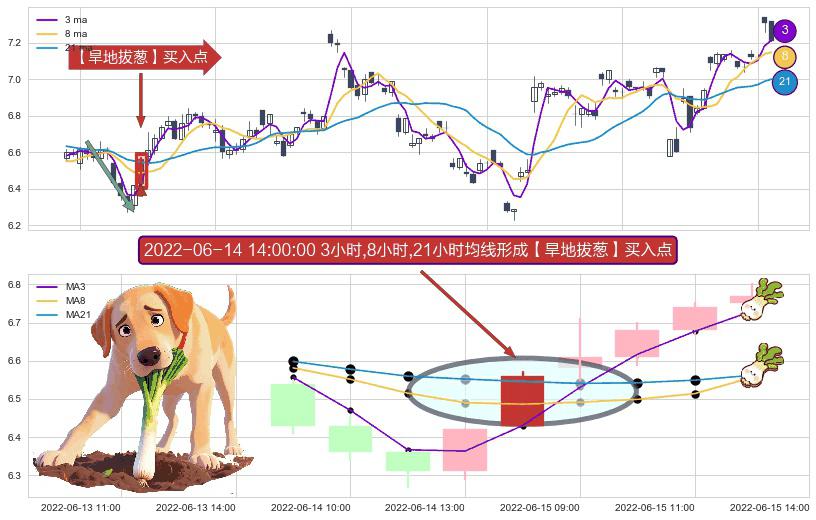 ⚀ 2022-06-14 14:00:00小时显现 3小时-8小时-21小时均线 【旱地拔葱】买入点 看多信号,后市看涨,买入