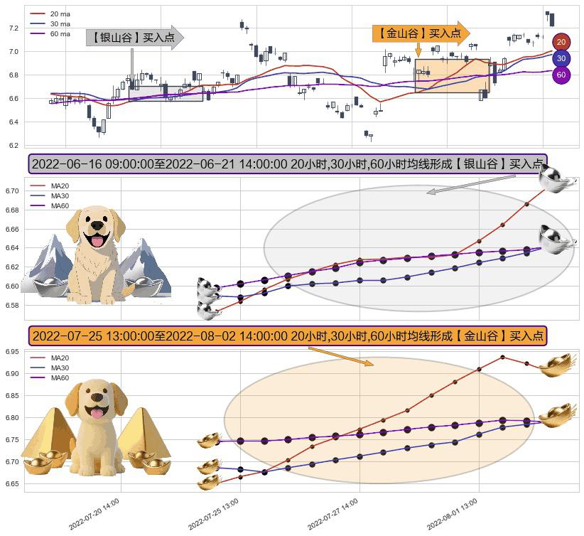 ⚀ 2022-07-25 14:00:00-小时至2022-08-02 14:00:00-小时显现 20小时-30小时-60小时均线 【金山谷】买入点 其再次确认了买入信号,可靠性更强,买入