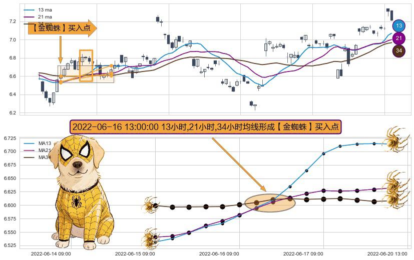 ⚀ 2022-06-16 13:00:00小时显现 13小时-21小时-34小时均线 【金蜘蛛】买入点 看多信号,后市看涨,买入