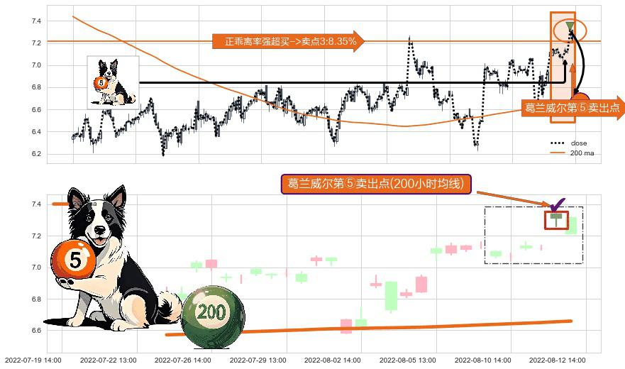 ⚀ 2022-08-12 13:00:00-小时显现 葛兰威尔均线 200小时均线 第⑤卖出点 上升趋势均值回复的短线回落信号,后市看跌,卖出信号