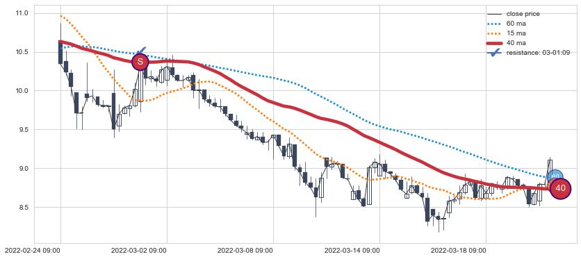 02-24 09:00至03-22 11:00 慢线与快线呈空头排列, 慢线与快线接触少,无缠绕