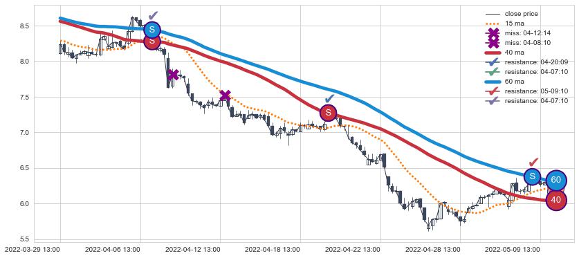 04-07 10:00至05-10 09:00 慢线与快线呈空头排列, 慢线与快线接触少,无缠绕