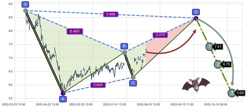 ➢ 距离预测D点位置尚有上涨空间,短线依然【看涨】, 耐心等待看跌【蝙蝠】形态反转启动