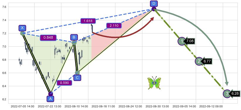 ➣ 未完成【蝴蝶】形态起点X: 06-28:13, 已到达C点: 08-02:14, 预测最终D点: 08-26:11, 共122交易小时