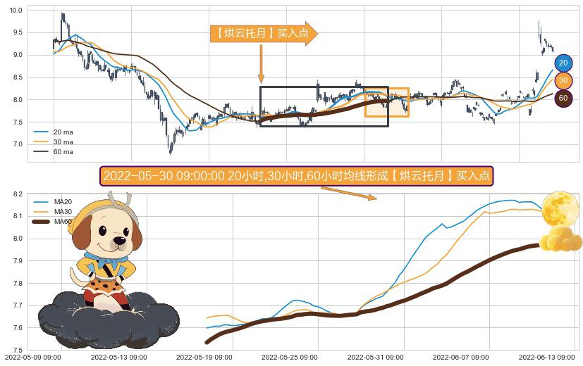 ⚀ 2022-05-17 14:00:00小时-2022-06-10 09:00:00小时显现 20小时-30小时-60小时均线 【烘云托月】买入点 看多信号,后市看涨,买入