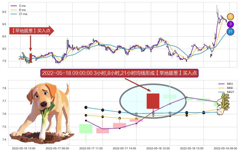 ⚀ 2022-05-18 09:00:00小时显现 3小时-8小时-21小时均线 【旱地拔葱】买入点 看多信号,后市看涨,买入