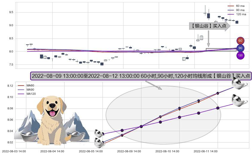 ⚀ 2022-08-09 14:00:00-小时至2022-08-12 13:00:00-小时显现 60小时-90小时-120小时均线 【银山谷】买入点 看多信号,后市看涨,买入