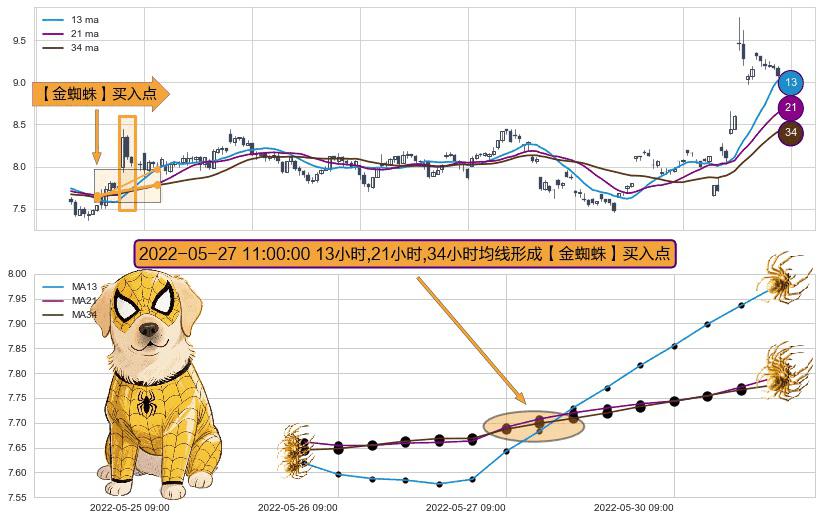 ⚀ 2022-05-27 11:00:00小时显现 13小时-21小时-34小时均线 【金蜘蛛】买入点 看多信号,后市看涨,买入