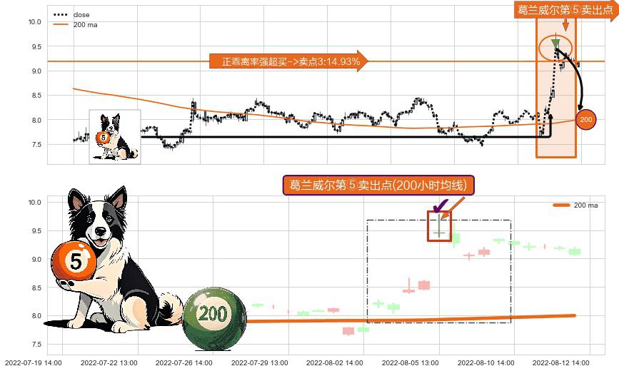 ⚀ 2022-08-05 13:00:00-小时显现 葛兰威尔均线 200小时均线 第⑤卖出点 上升趋势均值回复的短线回落信号,后市看跌,卖出信号