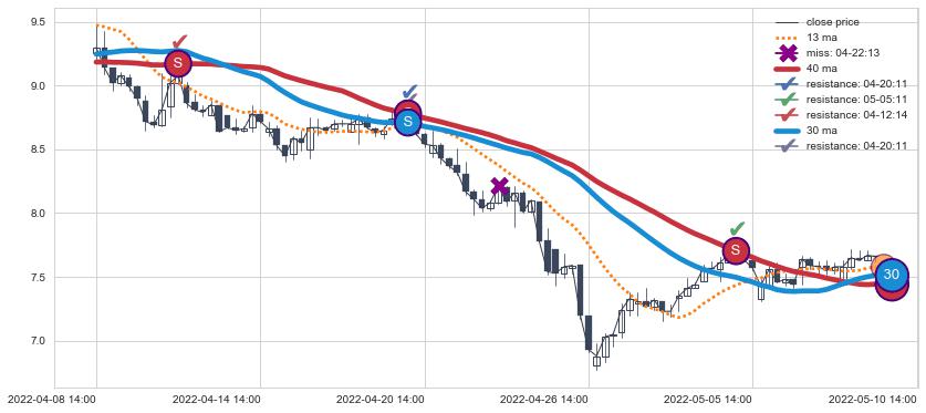 04-08 14:00至05-10 14:00 慢线与快线呈空头排列, 慢线与快线接触少,无缠绕
