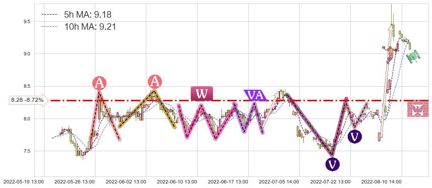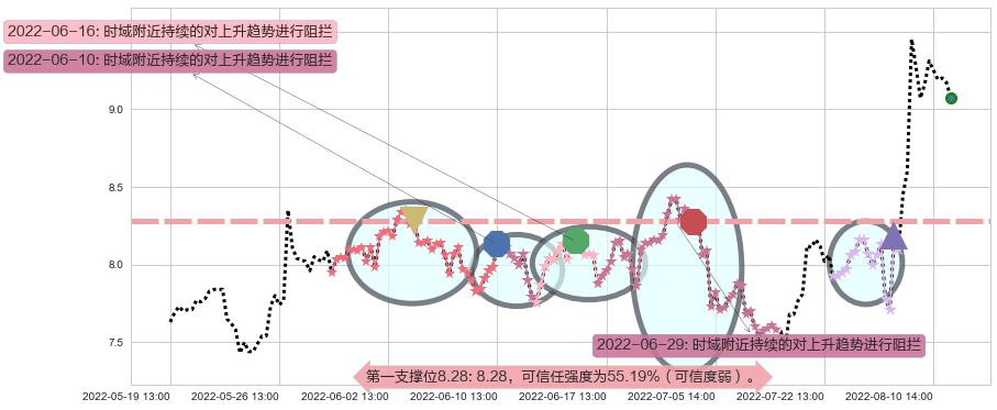 2022-06-10: 时域附近第一支撑位8.28持续的对上升趋势进行阻拦,有效放缓了上涨的速度。