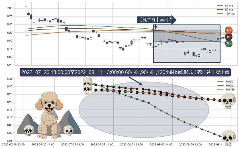 ⚀ 2022-07-26 14:00:00-小时至2022-08-11 13:00:00-小时显现 60小时-90小时-120小时均线 【死亡谷】卖出点 看空信号,后市看跌,卖出