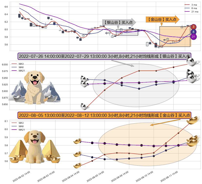 ⚄ 2022-08-05 14:00:00-小时至2022-08-12 13:00:00-小时显现 3小时-8小时-21小时均线 【金山谷】买入点 其再次确认了买入信号,可靠性更强,买入