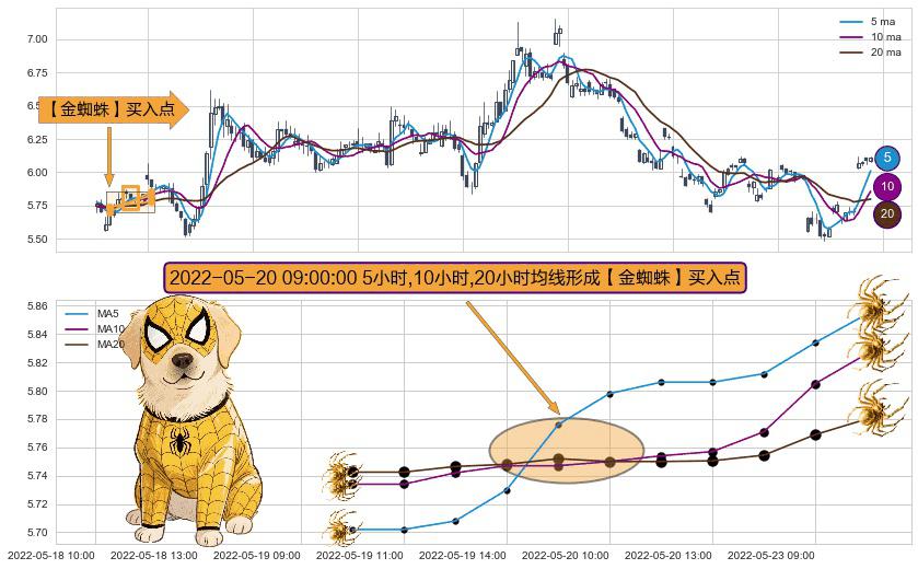 ⚀ 2022-05-20 09:00:00小时显现 5小时-10小时-20小时均线 【金蜘蛛】买入点 看多信号,后市看涨,买入
