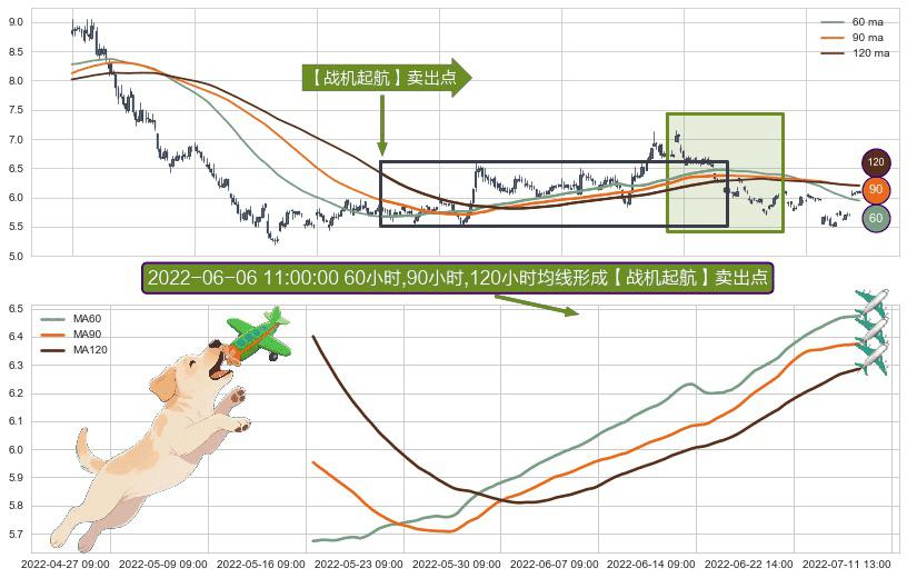 ⚀ 2022-05-16 11:00:00小时-2022-07-05 13:00:00小时显现 60小时-90小时-120小时均线 【战机起航】卖出点 看空信号,后市看跌,卖出