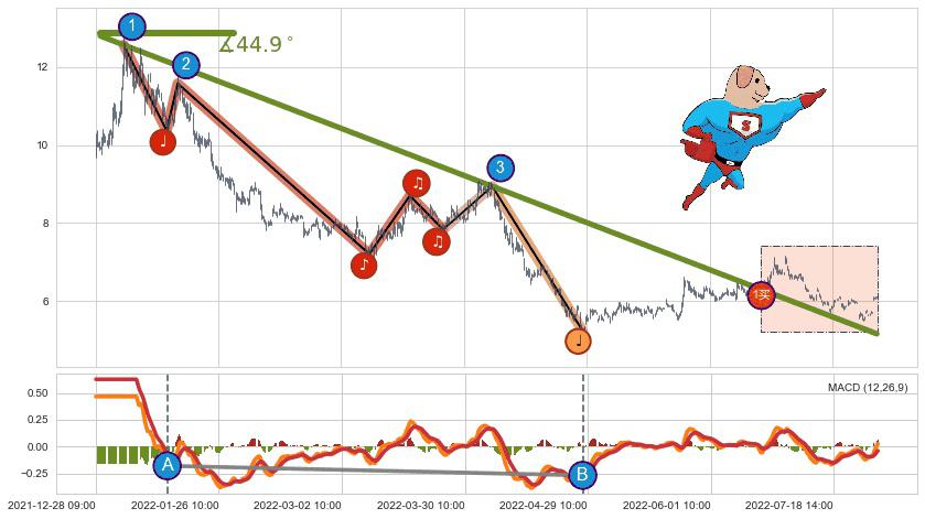 从2022-06-14 10:00至2022-08-03 14:00,共包含85个小时,阶段股价下跌-5.29%,阶段股价变动位移路程比: 1 : 18
