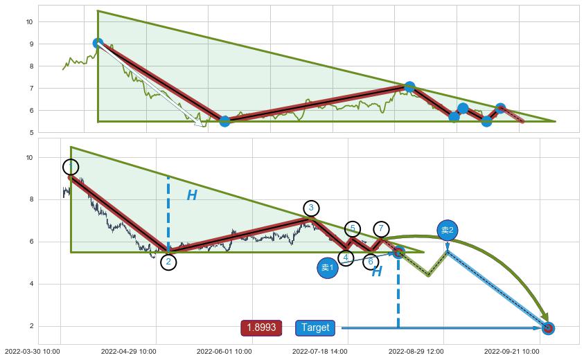➣ 最小中继整理跌幅→𝐇: 3.601 (下侧直角边第一支撑点②与斜边垂直距离)