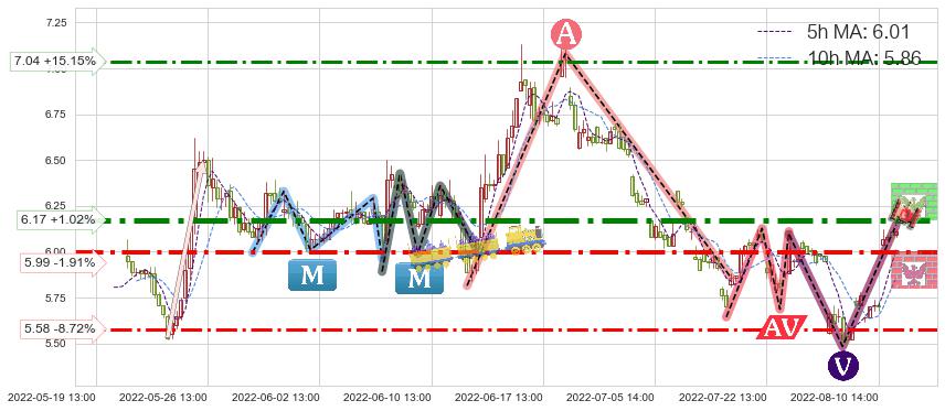 ♘ 阻力价格位6.17,可信任强度86.87%,距离最后交易2022-08-12 14:00形成的收盘价格6.11相差 +1.02%