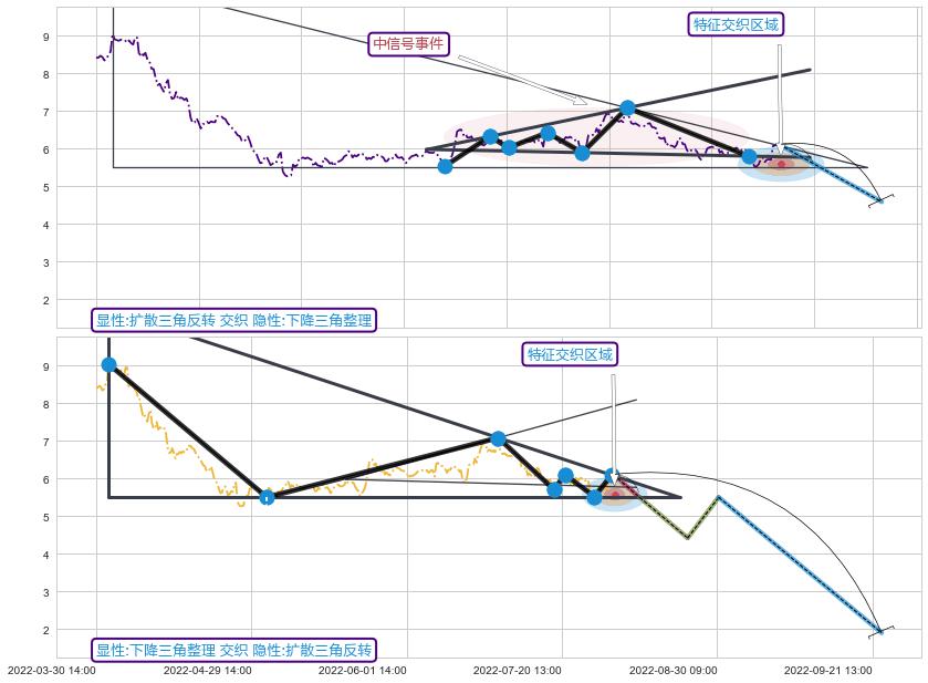 | 5 🅚:顶部尽头线(下山虎) ➕ 📐:扩散三角反转下行突破支撑位破位, 猜想持续下沉下跌,被突破的支撑位已变为阻力位 ☞ 看空信号 ⇥ 【🅚线】交织【图形】⇥ 综合量化分数: 49 | > |
