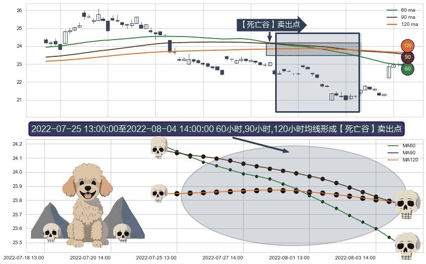 ⚀ 2022-07-25 14:00:00-小时至2022-08-04 14:00:00-小时显现 60小时-90小时-120小时均线 【死亡谷】卖出点 看空信号,后市看跌,卖出