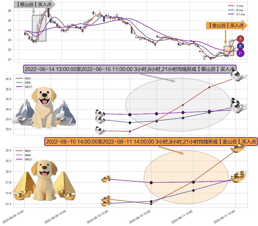 ⚀ 2022-08-11 13:00:00-小时至2022-08-11 14:00:00-小时显现 3小时-8小时-21小时均线 【金山谷】买入点 其再次确认了买入信号,可靠性更强,买入
