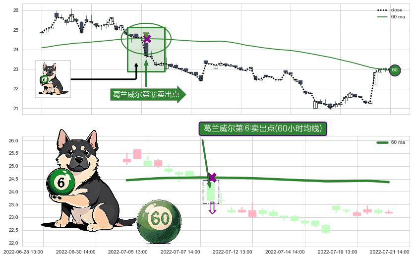 ⚀ 2022-07-08 13:00:00-小时显现 葛兰威尔均线 60小时均线 第⑥卖出点 走势反转见顶信号,后市看跌,卖出信号