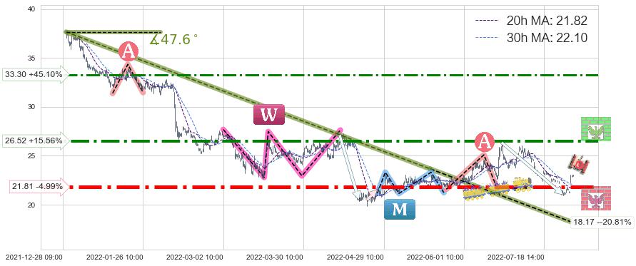 ♞ 20小时均线:21.82,30小时均线:22.10→ 快线<慢线