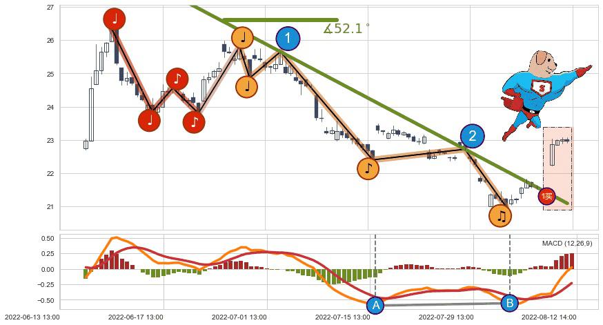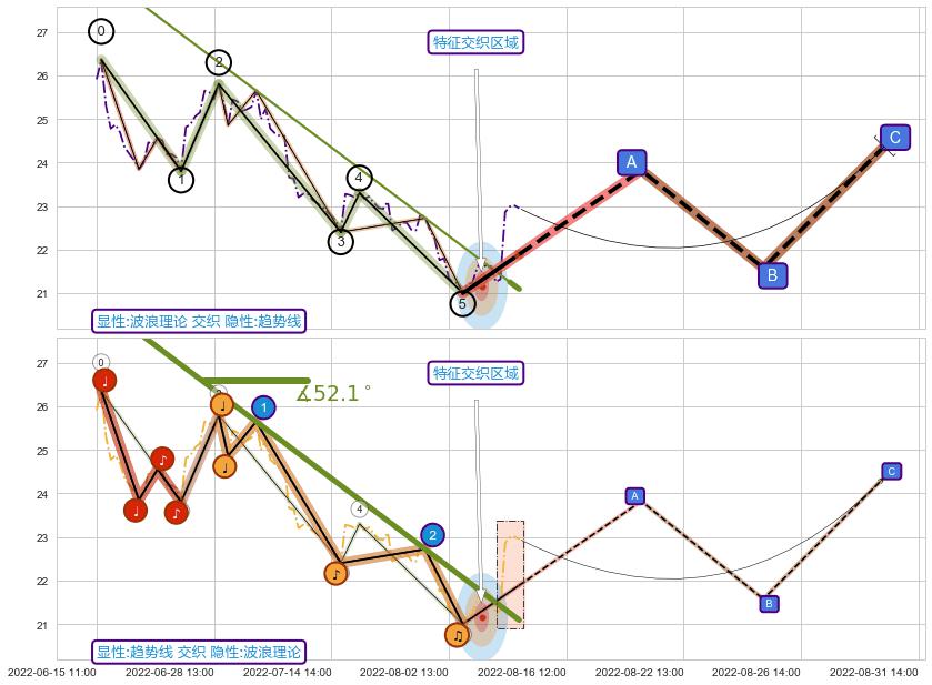 ➣ 2022-06-15 13:00-2022-08-11 14:00下跌趋势存在反转上涨[机会],其原下跌趋势的阻力位(21.09)已被突破[强支撑信号],原下跌趋势角度: 52.1˚