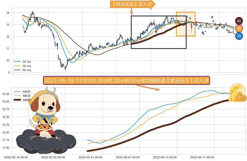 形态多维评估: ⚀ 2022-05-27 11:00:00小时-2022-06-23 13:00:00小时显现 20小时-30小时-60小时均线 【烘云托月】买入点 看多信号,后市看涨,买入