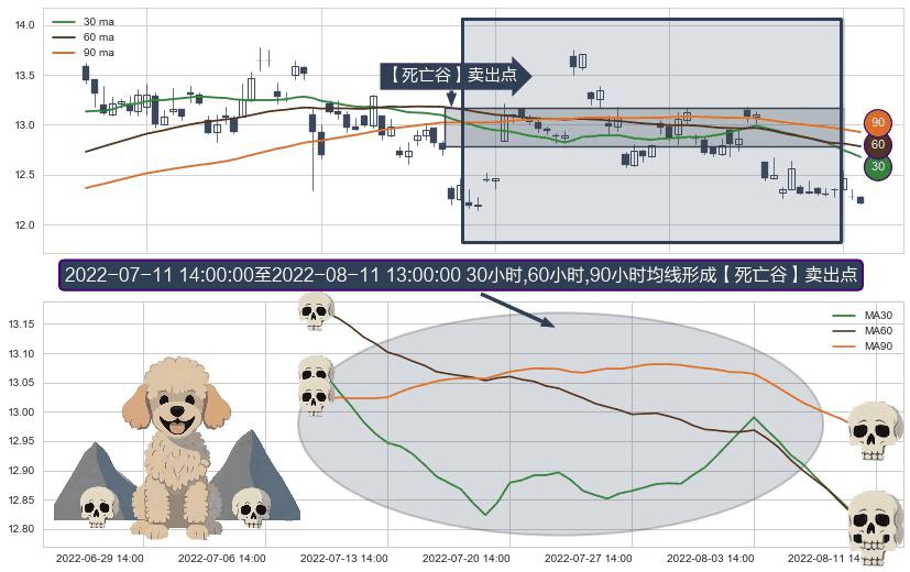 形态多维评估: ⚀ 2022-07-12 13:00:00-小时至2022-08-11 13:00:00-小时显现 30小时-60小时-90小时均线 【死亡谷】卖出点 看空信号,后市看跌,卖出