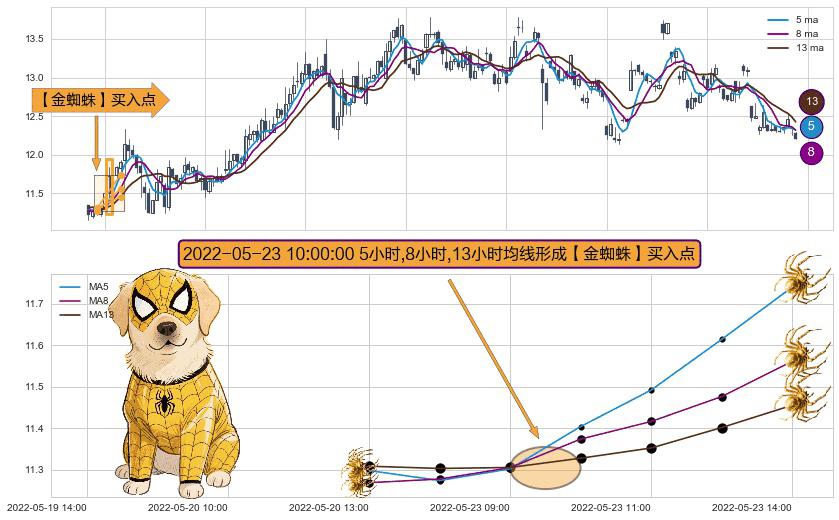 形态多维评估: ⚀ 2022-05-23 10:00:00小时显现 5小时-8小时-13小时均线 【金蜘蛛】买入点 看多信号,后市看涨,买入