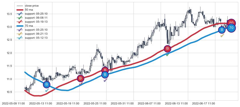 上涨趋势05-09 11:00-06-23 13:00,均线50, 70确认关键支撑5处
