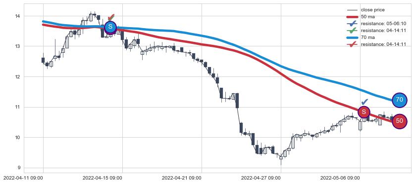 下跌趋势04-11 09:00-05-09 13:00,均线50, 70确认关键阻力2处