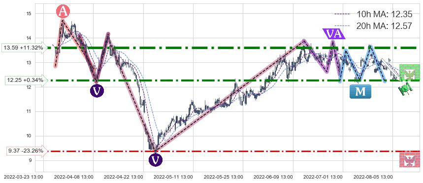 ♘ 阻力价格位13.59,可信任强度99.00%,距离最后交易2022-08-12 14:00形成的收盘价格12.21相差 +11.32%