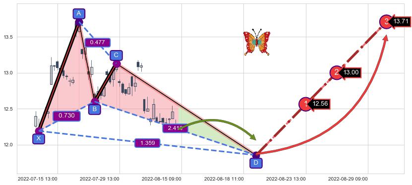 ➢ 未完成【蝴蝶】形态起点X: 07-12:13, 已到达C点: 07-28:14, 预测最终D点: 08-19:09, 共71交易小时