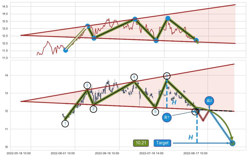 ➢ 最小反转跌幅→𝐇: 1.8008 (逐步抬高阻力斜边最后的阻力点⑥与支撑边垂直距离)