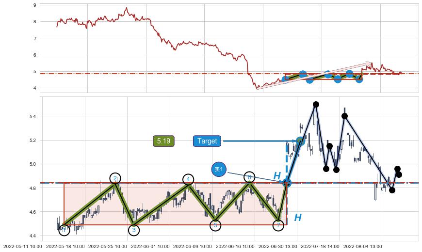 ➣ 最小中继整理涨幅→𝐇: 0.35000 (上平行阻力线与下平行支撑线的垂直距离)