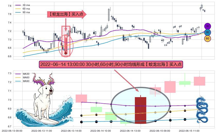 ⚀ 2022-06-14 13:00:00小时显现 30小时-60小时-90小时均线 【蛟龙出海】买入点 看多信号,后市看涨,买入